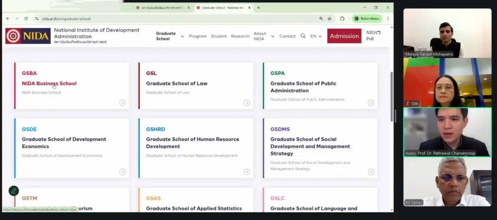 On November 3, 2025, Associate Professor Dr. Pattrawut Charoenroop, Assistant to the President for International Affairs, participated in an online meeting via Zoom with Professor Dr. B.S. Sahay, Director, and Dr. Malaya Ranjan Mohapatra, Chairperson, from the Indian Institute of Management Jammu (IIM Jammu). Established by the Government of India under the Ministry of Education, IIM Jammu is a leading management institute.