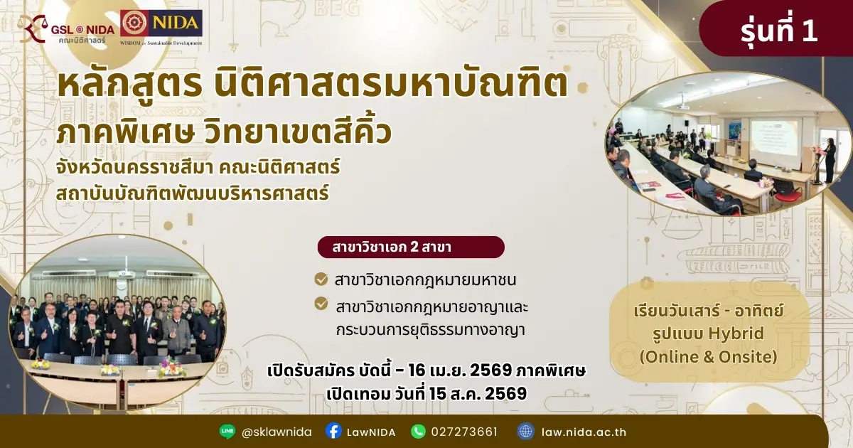 โอกาสดีที่ไม่ควรพลาด! คณะนิติศาสตร์ สถาบันบัณฑิตพัฒนบริหารศาสตร์ (NIDA) หลักสูตร นิติศาสตรมหาบัณฑิต (LL.M.) วิทยาเขตสีคิ้ว จ.นครราชสีมา เปิดรับสมัคร 2 สาขาวิชาเอก
