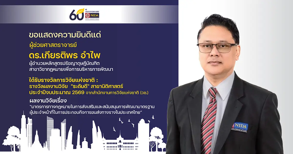 สถาบันบัณฑิตพัฒนบริหารศาสตร์ ขอแสดงความยินดีแก่ ผศ.ดร.เกียรติพร อำไพ ผู้อำนวยการหลักสูตรปรัชญาดุษฎีบัณฑิต สาขากฎหมายเพื่อการบริหารการพัฒนา รับรางวัลการวิจัยแห่งชาติ : รางวัลผลงานวิจัย “ระดับดี” สาขานิติศาสตร์ ประจำปีงบประมาณ 2569 จากสำนักงานการวิจัยแห่งชาติ (วช.) เรื่อง “มาตรการทางกฎหมายในการส่งเสริมและสนับสนุนการพัฒนามาตรฐานผู้ประจำหน้าที่ในการประกอบกิจการขนส่งทางรางในประเทศไทย”