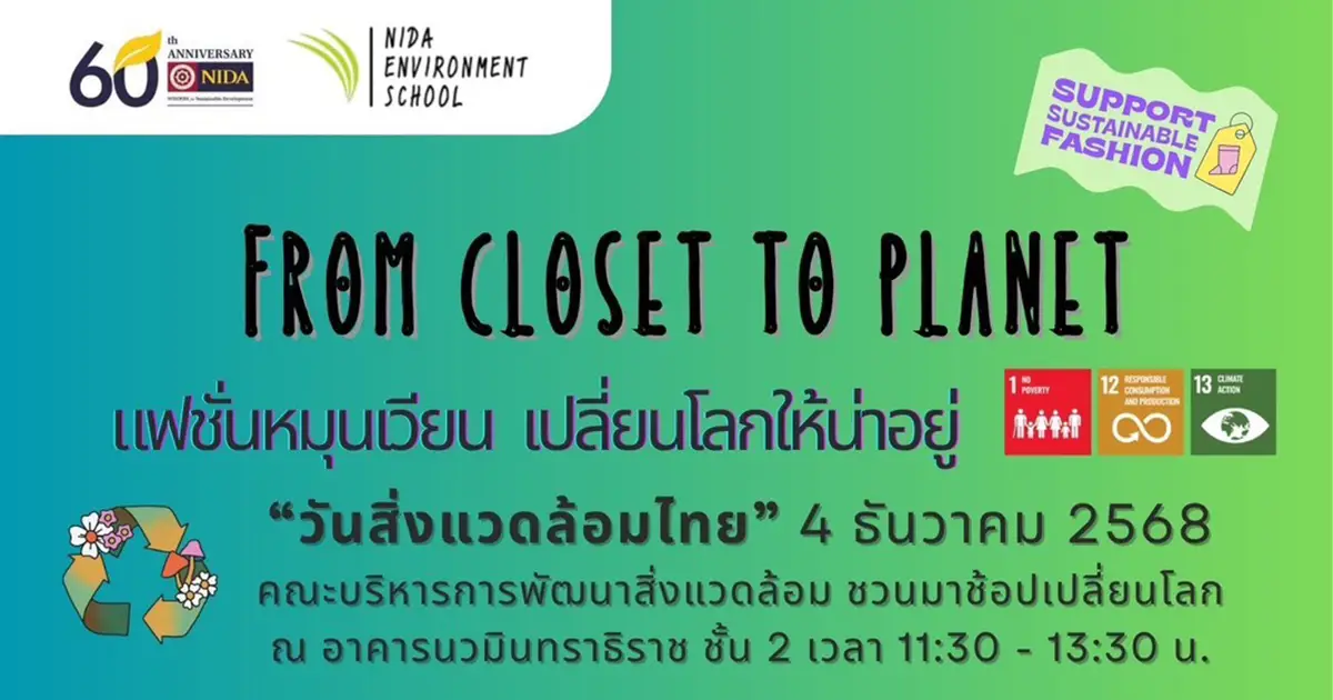 นักศึกษา และผู้ที่สนใจร่วมเฉลิมฉลองในโอกาสสุดพิเศษ ครบรอบ 60 ปี นิด้า ด้วยการรวมพลังเป็น “ผู้ให้” เพื่อสร้างความยั่งยืนให้กับสิ่งแวดล้อม ในกิจกรรม “From Closet to Planet: แฟชั่นหมุนเวียน เปลี่ยนโลกให้น่าอยู่” ซึ่งจะจัดขึ้นเนื่องในวันสิ่งแวดล้อมไทย วันที่ 4 ธันวาคมนี้